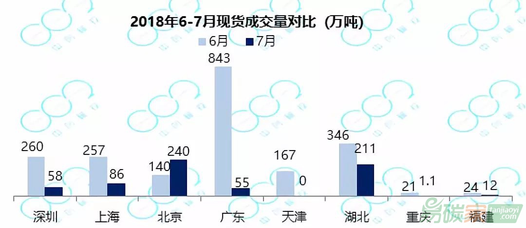 截至2018年7月31日,一、二級(jí)現(xiàn)貨市場(chǎng)累計(jì)成交2.57億噸,成交額57.25億元。廣東、湖北成交量最高,位于第一梯隊(duì);深圳、上海、北京位于第二梯隊(duì);而天津、重慶、福建的成交量相對(duì)較低,位于第三梯隊(duì)。