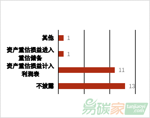 國際上碳排放會計準(zhǔn)則的缺失造成不同公司間的財務(wù)報告存在差異,影響會計信息的可比性。特許公認(rèn)會計師公會(ACCA)2010年對26家歐盟碳排放體系下公司的一項調(diào)查顯示,公司對碳配額的處理方式差異較大。在對碳配額的初始計量上,對于免費發(fā)放的配額,11家公司將其視為無形資產(chǎn)入賬,2家公司視作存貨入賬,6家公司作為其他資產(chǎn)入賬,而7家公司則選擇不做賬務(wù)處理;對于購買的配額,11家公司作為無形資產(chǎn),7家公司不做披露,3家公司作為存貨,2家公司作為其他資產(chǎn),3家公司視交易目的而定,對履約目的配額和交易目的配額采取不同的處理方式。在后續(xù)計量上,5家公司不進行攤銷和折舊,3家公司進行攤銷或折舊,而另18家公司的處理方式并未公布;在資產(chǎn)重估處理上,13家公司并未公布處理方式,11家公司將估值損益直接計入利潤表,1家公司將估值損益計入重估儲備科目,1家公司做其他賬務(wù)處理(如圖1-圖4所示)。由上述數(shù)據(jù)可以看出,不同公司對碳配額會計處理的方式存在差異,將其確認(rèn)為無形資產(chǎn)的賬務(wù)處理方式較常見,但存在信息披露不完全的現(xiàn)象[4]。