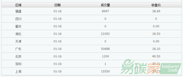 根據(jù)7個(gè)省份的碳排放交易試點(diǎn)數(shù)據(jù)來看,目前碳價(jià)格整體水平在20-50元/噸。對于企業(yè)來說,影響還比較小。對于純投資者而言有較大的風(fēng)險(xiǎn),但機(jī)會也很大。截至到1月16日,從成交量來看,廣東、湖北及上海占比較大。