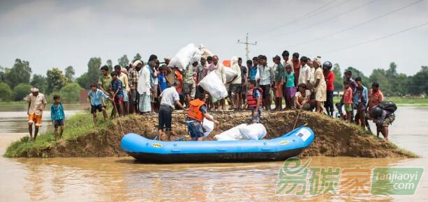 ▲食物和飲用水通過木筏運送到尼泊爾班克縣的一個村莊,當(dāng)時該村的道路因暴雨而被切斷。聯(lián)合國