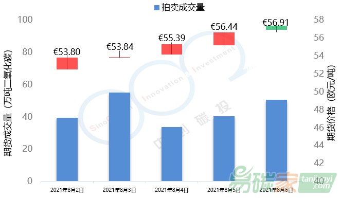 2021年8月2日至8月6日,本周由于天然氣價(jià)格的持續(xù)走強(qiáng),歐盟碳價(jià)與英國(guó)碳價(jià)經(jīng)歷了不同程度的上漲,歐盟碳價(jià)由54.37歐元/噸上漲至56.61歐元/噸,漲幅為4%。英國(guó)碳價(jià)波動(dòng)則相對(duì)較大,由53.80歐元/噸上漲至56.91歐元/噸,漲幅為6%,反超歐盟碳價(jià)。本周歐盟碳市場(chǎng)期貨成交量為1.21億噸。此外,由于歐盟委員會(huì)修訂了2021-2022的拍賣日歷,部分拍賣配額納入市場(chǎng)穩(wěn)定儲(chǔ)備(MSR),歐盟配額拍賣量在本周幾乎減半,縮減為755萬(wàn)噸。英國(guó)碳市場(chǎng)本周拍賣成交量為219萬(wàn)噸。