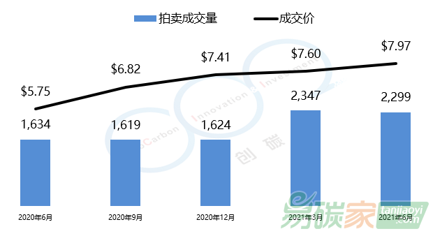 RGGI碳市場(chǎng)的初始配額發(fā)放以拍賣為主,每個(gè)季度舉行一次拍賣。2021年第二季度拍賣成交均價(jià)為$7.97美元,較上一季度漲幅為4.9%。RGGI該次拍賣總成交量為2299萬(wàn)噸。以下是由中創(chuàng)碳投統(tǒng)計(jì)的RGGI近一年的交易情況。