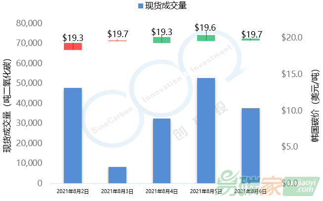 2021年8月2日至8月6日,本周韓國(guó)碳價(jià)由19.3美元/噸上漲至19.7美元/噸。韓國(guó)碳市場(chǎng)本周成交量近18萬(wàn)噸,遠(yuǎn)高于上周的4萬(wàn)噸水平。