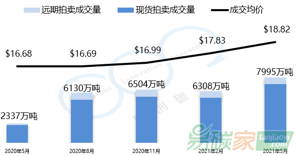 加州-魁北克碳市場(chǎng)的初始配額發(fā)放以拍賣為主,每個(gè)季度舉行一次拍賣。2021年5月的第27次拍賣均價(jià)與總成交量創(chuàng)歷史新高。拍賣均價(jià)為18.82美元,較上一季度漲幅為5.6%,總成交量為7995萬(wàn)噸。以下是由中創(chuàng)碳投統(tǒng)計(jì)的加州-魁北克碳市場(chǎng)近一年的交易情況。