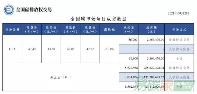 市場(chǎng)碳排放配額(CEA)掛牌協(xié)議交易成交量56,000噸,成交額2,364,470.00元,開盤價(jià)43.49元/噸,最高價(jià)43.50元/噸,最低價(jià)42.05元/噸,收盤價(jià)42.22元/噸,收盤價(jià)較前一日下跌3.14%。今日無(wú)大宗協(xié)議交易。今日全國(guó)碳排放配額(CEA)總成交量56,000噸,總成交額2,364,470.00元。